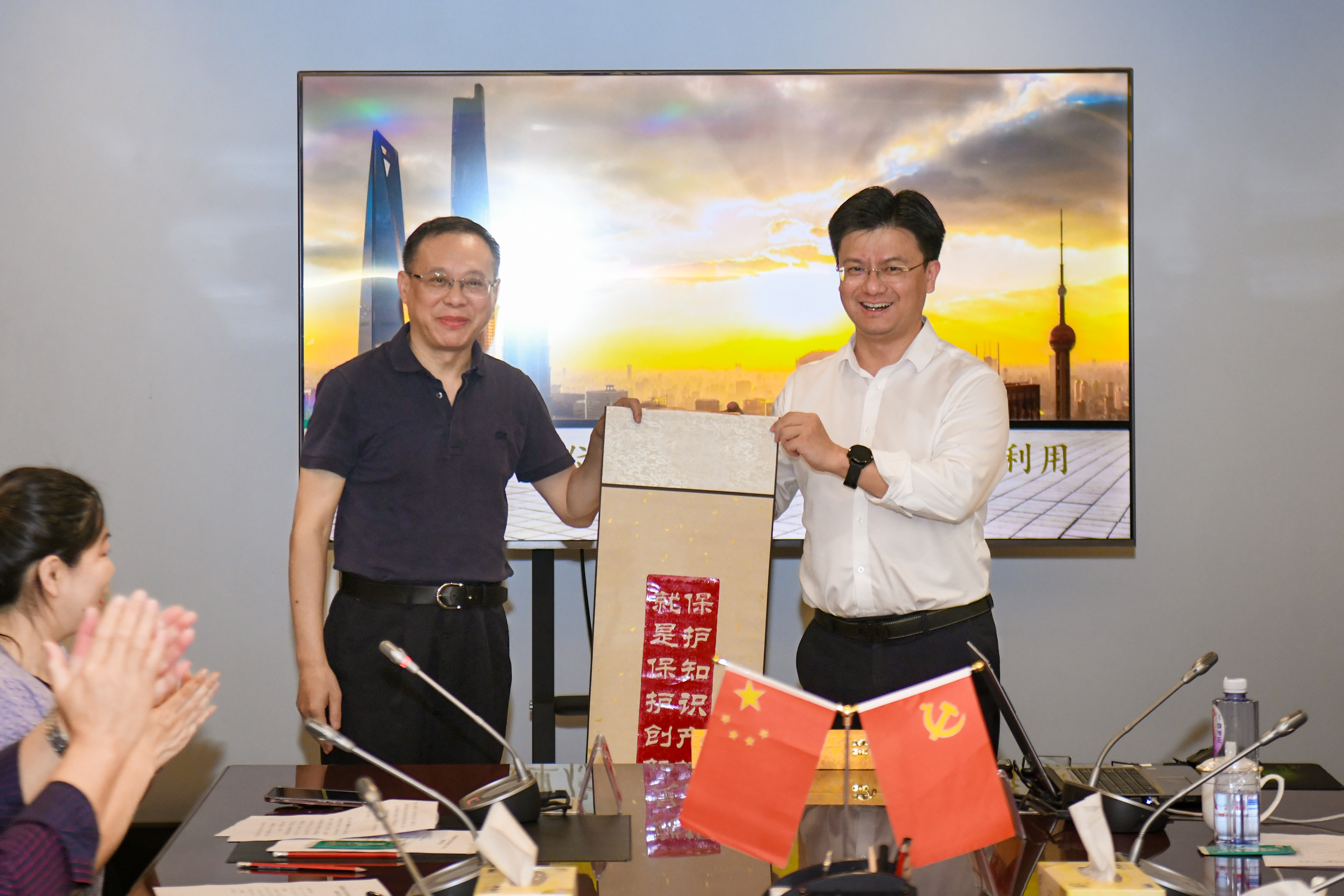 會(huì)上,郭國(guó)中主任向集團(tuán)捐贈(zèng)習(xí)近平總書記關(guān)于知識(shí)產(chǎn)權(quán)的重要指示“保護(hù)知識(shí)產(chǎn)權(quán)就是保護(hù)創(chuàng)新”的雕版卷軸,集團(tuán)黨委書記、董事長(zhǎng)、總經(jīng)理章理中代表集團(tuán)接收捐贈(zèng)。