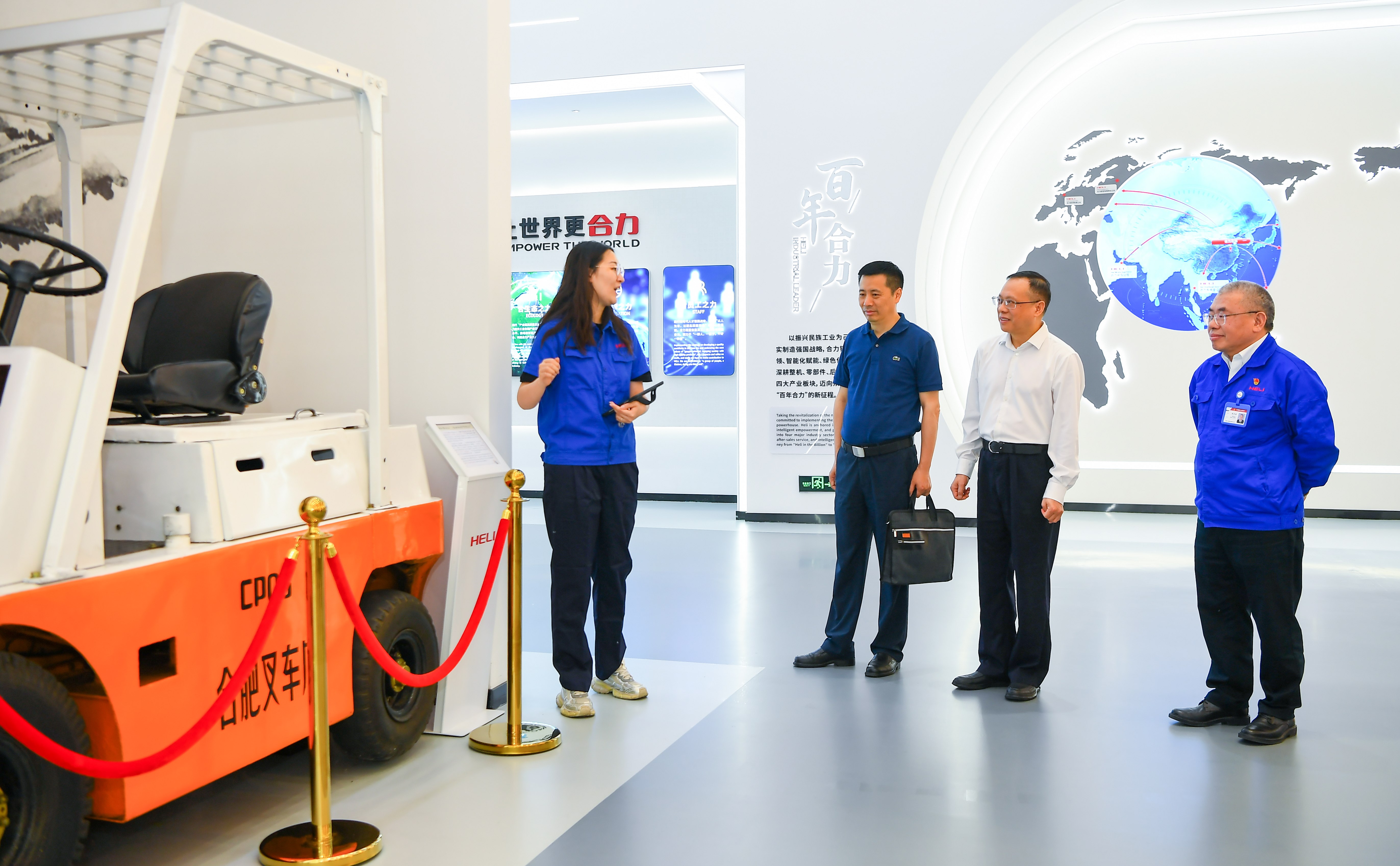 章理中一行首先參觀了合力數字化展廳。據介紹,安徽叉車集團是安徽省屬全資國有企業,始建于1958年,至今已有66年的發展歷程,是國家創新型企業、國家火炬計劃重點高新技術企業、安徽省工程機械建設(合肥)基地龍頭企業。其主營業務有工業車輛、智能運搬裝備、智能物流系統及核心零部件等。截至目前,企業主要經濟指標連續33年全國同行業前列,并于2016年躋身世界工業車輛行業七強。